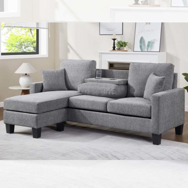 L Shaped Sectional Sofa with Dropdown Table and Reversible Chaise and 2 Pillows, Gray Chenille Images |
